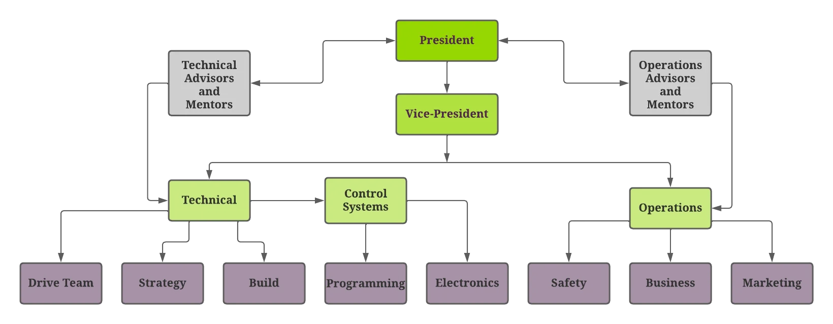 Our team structure had remained unchanged for years, with executive leadership and subteam captains but no hierarchy. However, in 2023, communication issues became so severe that the existing structure broke down. These problems had always existed but were amplified by the leadership dynamics that year. After consulting mentors, team members, and business stakeholders, we decided to restructure leadership. The goal was to redefine roles, introduce new ones, and implement a corporate-style hierarchy to improve communication.